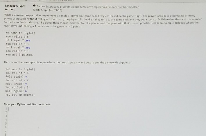 1 1 Decide who will start by having each player roll a dice the one with the highest score starts the game. Write a Python program to simulate the Two Dice Pig game. And to write a second program that will analyze a different.